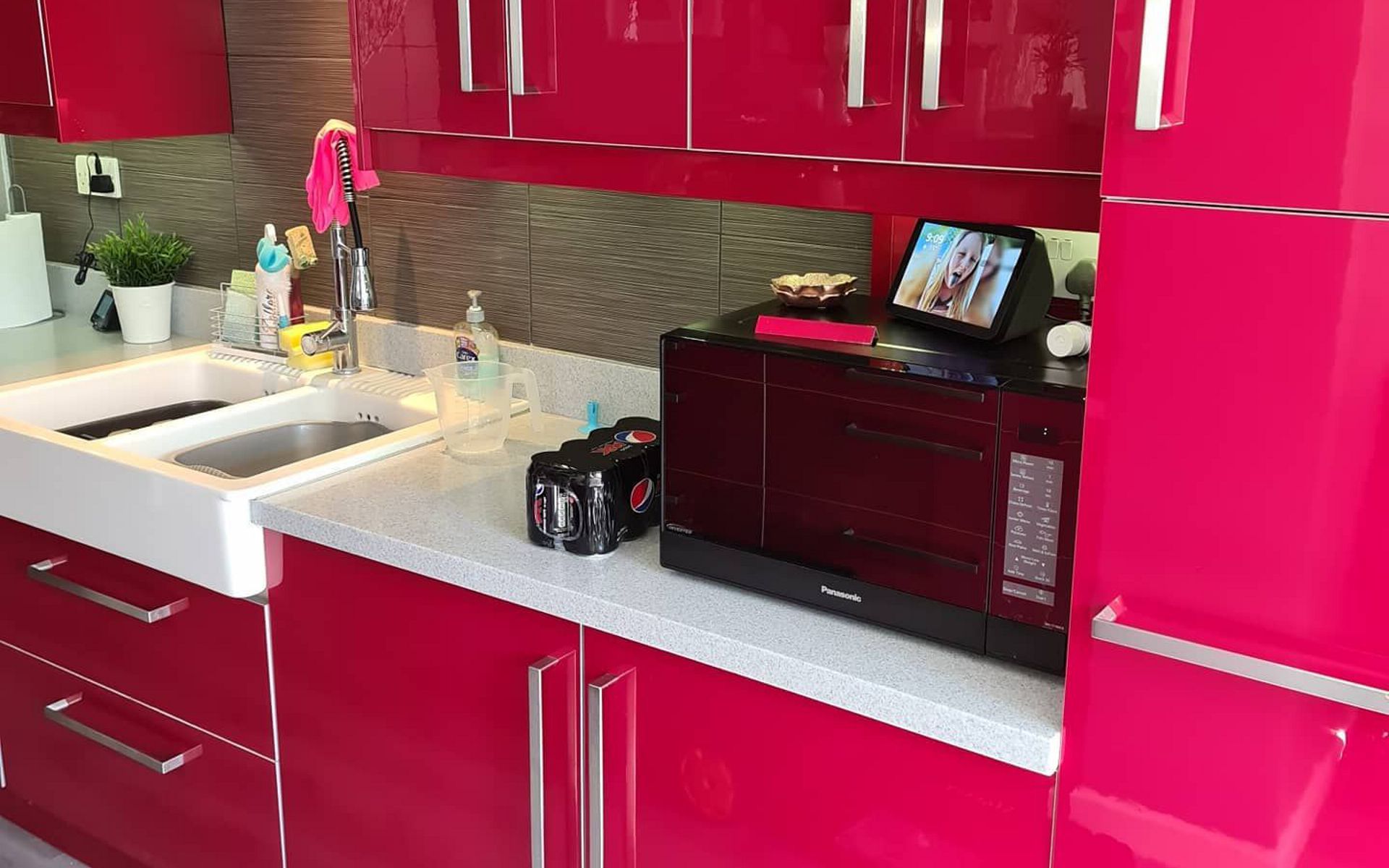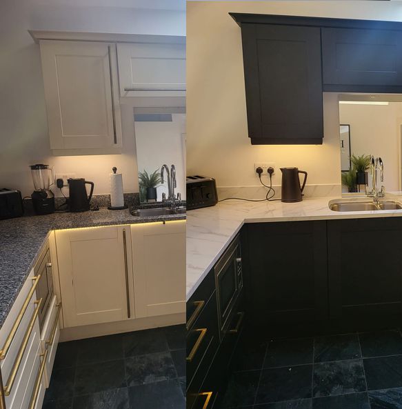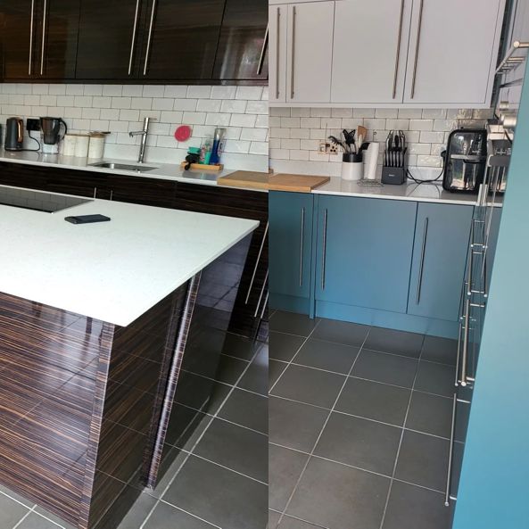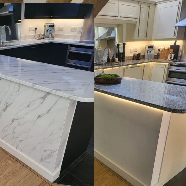 Vinyl Wrap Solutions wrap surfaces with specialised architectural vinyl which transforms surfaces with new vibrant colours. Colours are endless and bespoke which renovates kitchens cupboards, worktops and doors (many more applications possible) to look new and stunning.